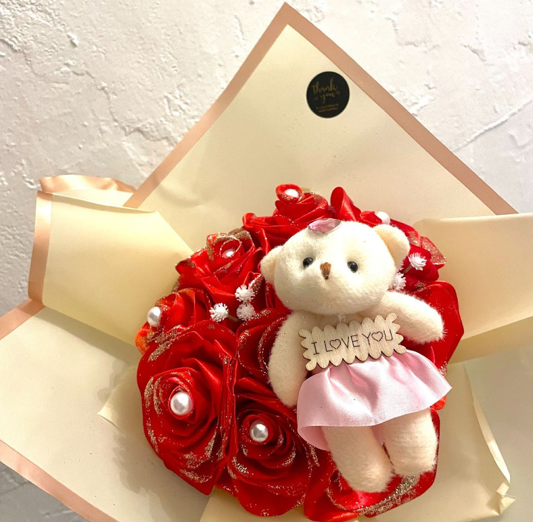 🌹✨ Bouquet de roses rouges pailletées avec perles & petit ours – 22€ ✨🌹