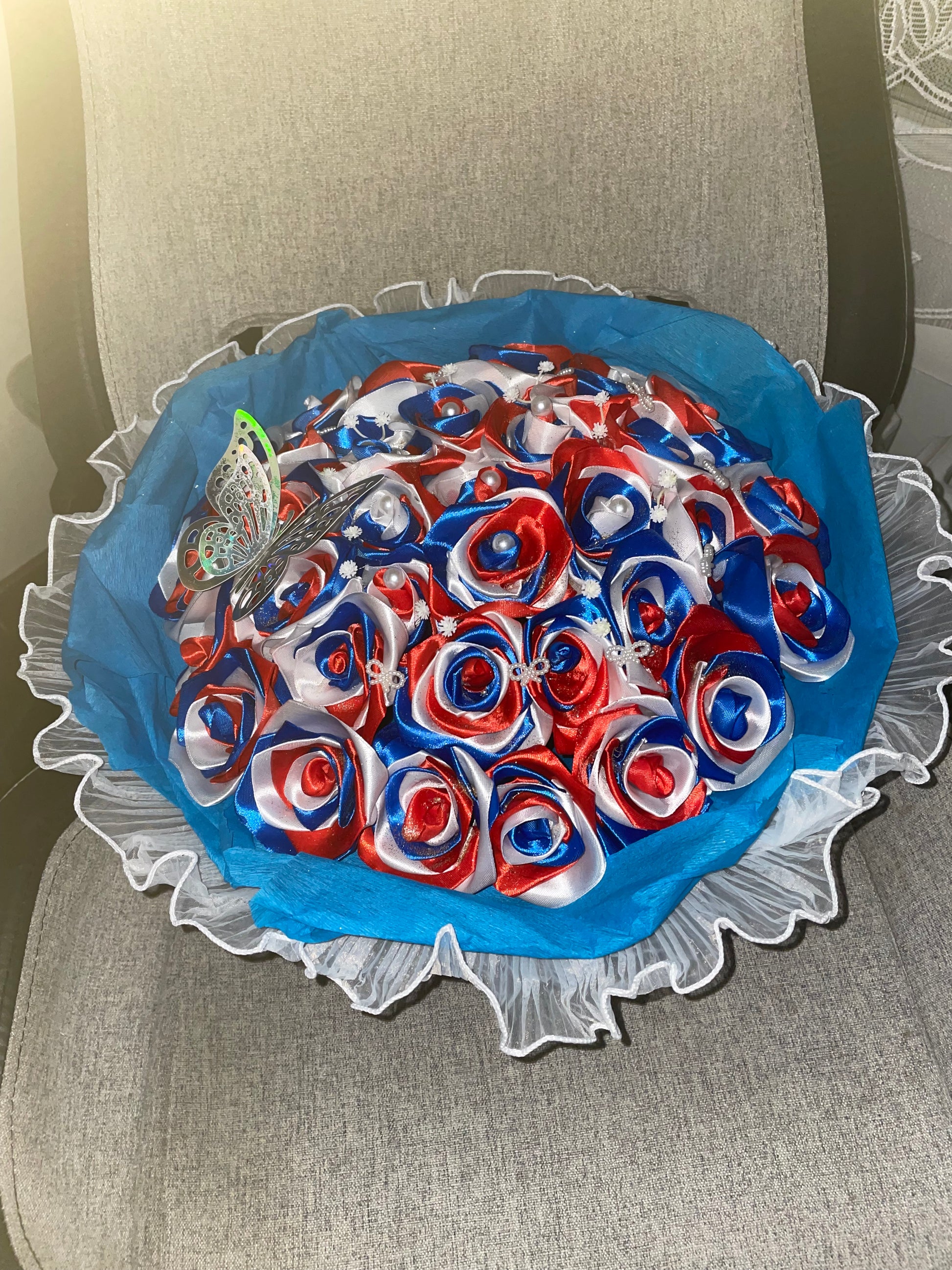 Magnifique bouquet fait main composé de roses en ruban satin bleu, blanc et rouge, décorées de perles et de papillons élégants.
