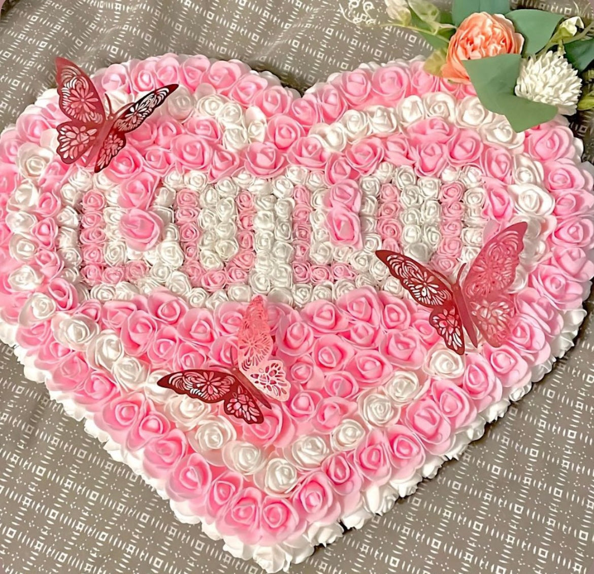 Un grand coeur en polystyrène entièrement habillé de fleurs en mousse rose et blanche, délicatement assorties pour une composition pleine de douceur. Chaque pièce est unique et personnalisée avec un message de votre choix, accompagné de petits papillons et fleurs décoratives de la couleur de votre choix. Idéal pour offrir lors d'un anniversaire, une naissance, un enterrement, une fete ou simplement pour dire "je t'aime" avec originalité.